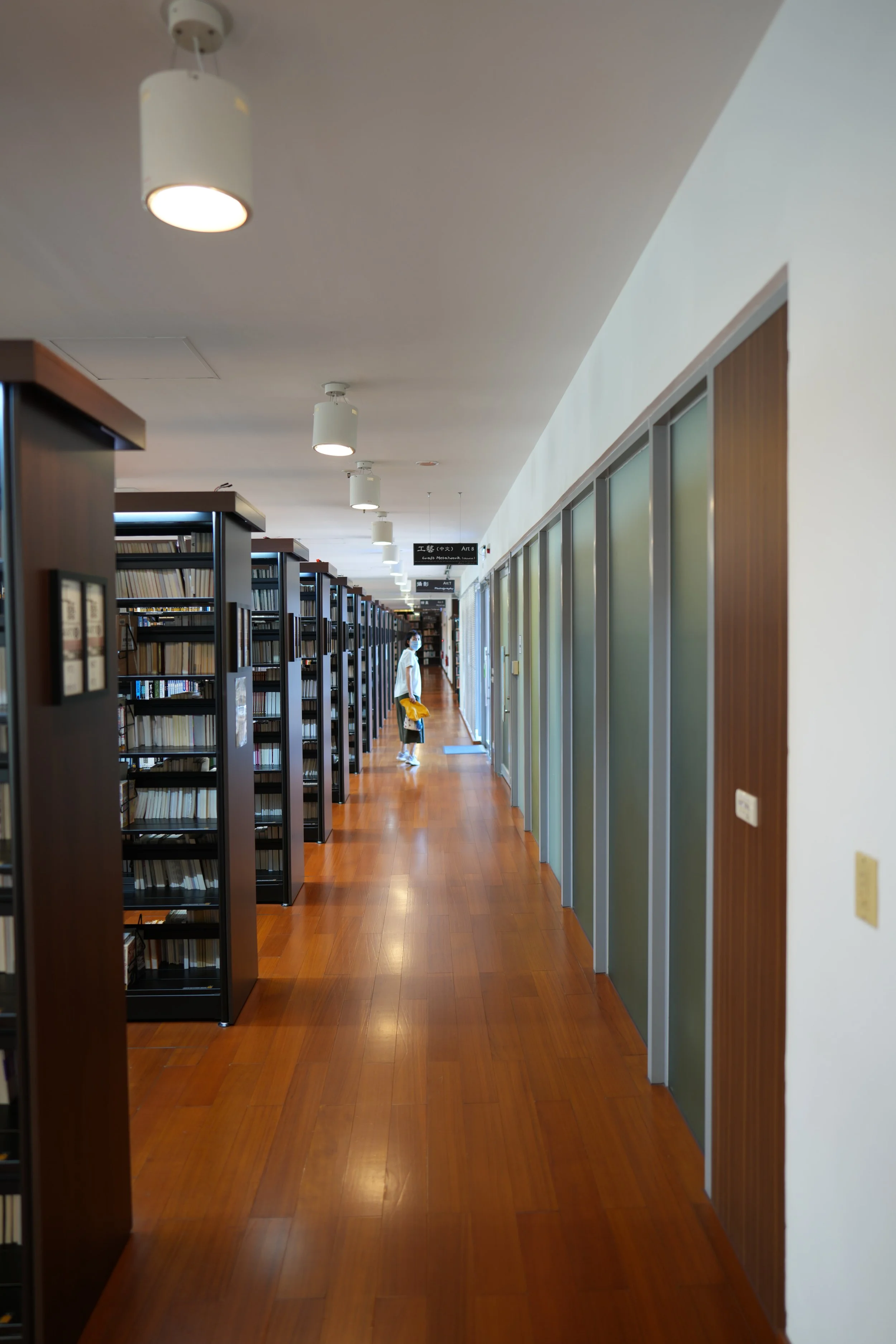 刻意呈現一個書架又一個無人觀看書架的堆疊與渴求功名讀書的學生們或考生形成冷漠的對比,書架堆疊越多形成的更多的冷漠,諷刺的是他們在這一個個冰冷書架旁邊的桌子上觀看的不是這些藝術書籍而是教科書。這不只有對比感而且有距離感,也是社會的寫照。