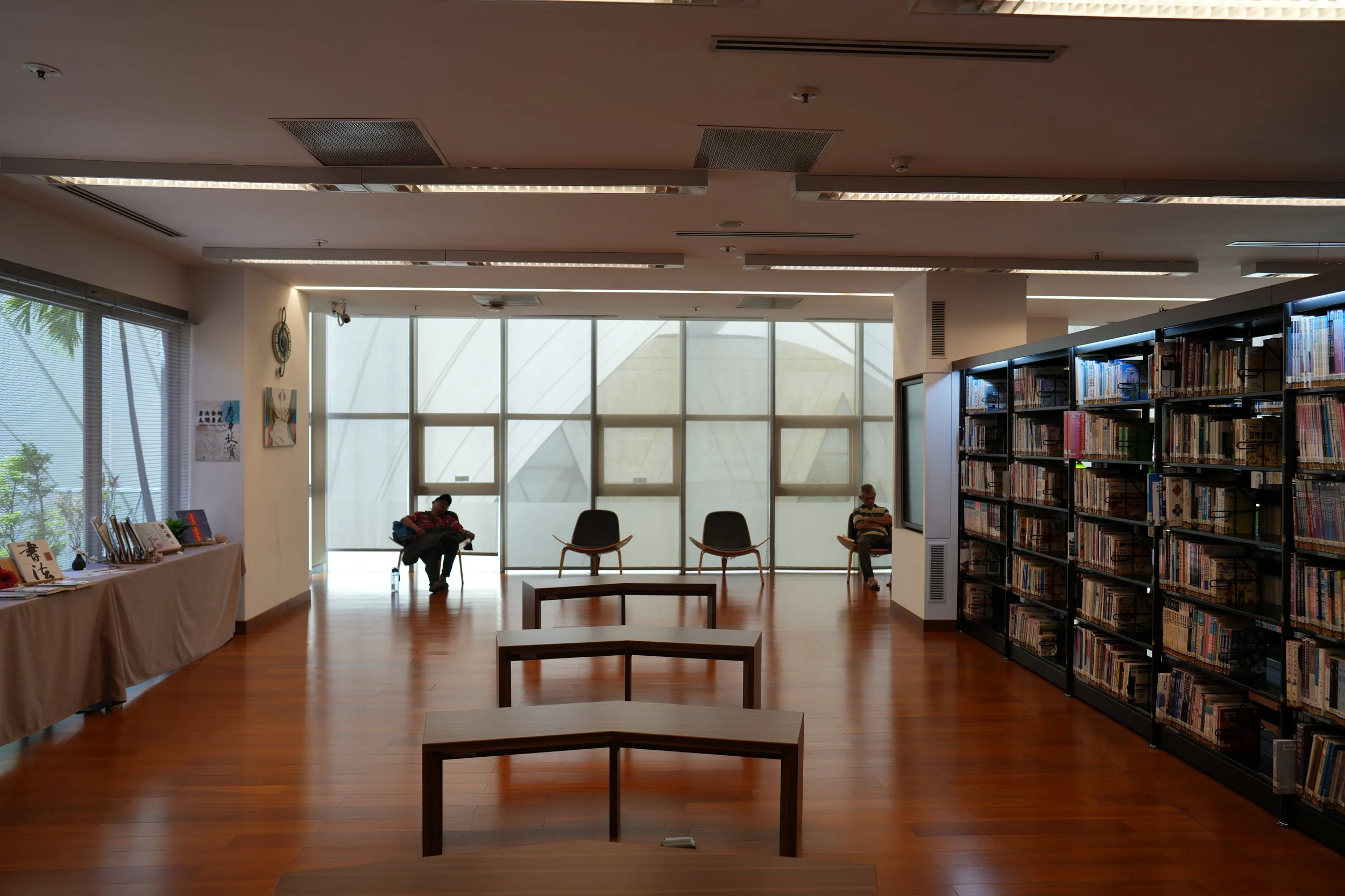 下面多張的圖片是強烈又冷酷的對比,地點是鳳山的大東藝術中心,在這些圖片中,冷氣下的民眾與冰冷書架間的強烈對比,不僅是空間和物質之間的分隔,吹著冷氣的民眾,是準備學生或國家考試的考生和吹冷氣的居民。